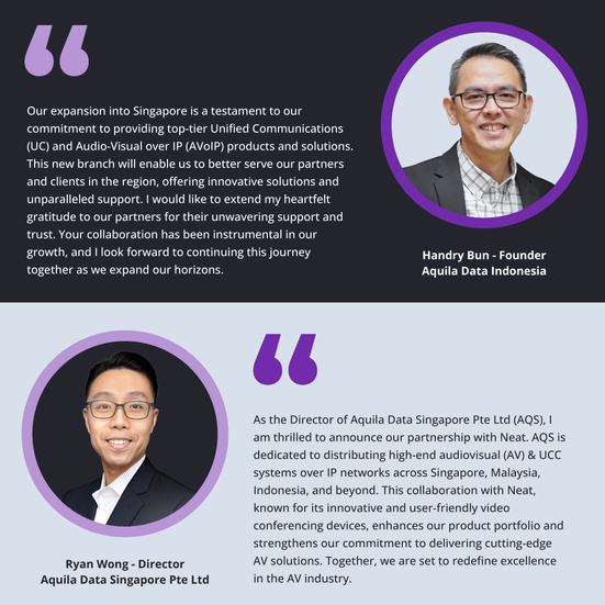 "We are thrilled to welcome Neat to our product portfolio," said Ryan Wong, Director at Aquila Data Singapore Pte Ltd. "This partnership aligns perfectly with our mission to deliver innovative and high-quality UCC & AV solutions to our partners and clients. Neat's products are a testament to excellence in design and functionality, and we are confident that our customers will greatly benefit from this collaboration.”