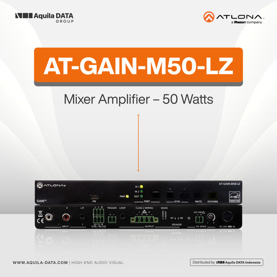 The AT-GAIN-M50-LZ provides 2 x 25 watts or 1 x 50 watts @ 4/8 ohms of audio amplification, as well as specialized features for education environments including ducking program audio for an instructor microphone, muting the system for public address messages, and output for assistive listening systems.