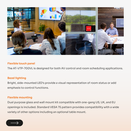 The VTP-700VL is an ideal user interface for AV control or room scheduling in corporate and education environments. Bright, side-mounted LED’s provide a visual representation of room status or add emphasis to control functions.