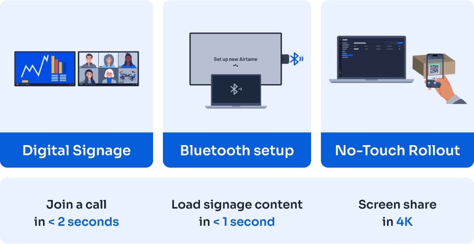 Airtame 3 allows users to join meetings or share screens in seconds — no cables, no dongles, and no software installation required. Whether you’re presenting from a laptop, tablet, or smartphone, connection is quick and intuitive. Video conferencing loads in under two seconds, helping teams start meetings on time, every time.